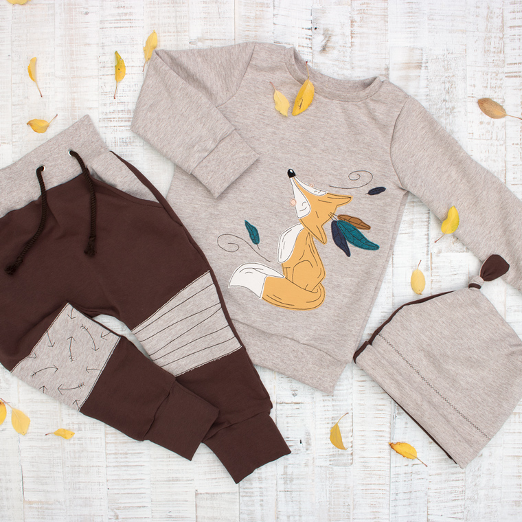 Auch die anderen beiden Schnittmuster habt ihr hier schon öfters gesehen. Für die Hose habe ich mich wieder für das Schnittmuster Baggy-Pants-Baby von Kid5 entschieden. (Die Mütze ist von Rapantinchen und ein Freebook.) Für mein wildes Herbst-Outfit habe ich mir überlegt ein paar Kniepatches auf die Hose aufzunähen. Allerdings nicht – wie üblich – in ihrer ovalen Form, sondern als große Flicken. Auf einen Flicken habe ich ein paar Indianer-Pfeile genähmalt, die ich vorher mit Trickmarker aufgezeichnet hatte. Den anderen Flicken habe ich minimal mit ein paar Linien aus Geradstichen abgesteppt.