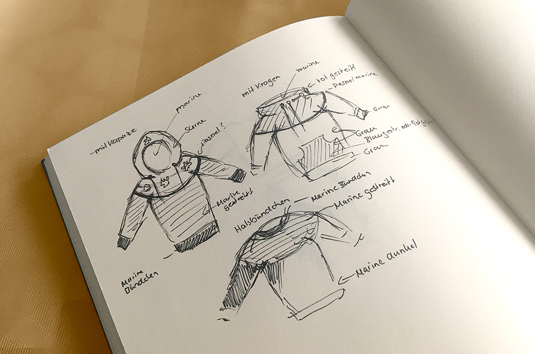Ich mache mir gerne Skizzen, auch wenn ich häufig kurz vor dem Nähen doch noch einmal umschwenke. Je nachdem wie mir gerade ist, nähe ich auch aus dem Bauch heraus. Für den Mini Mister habe ich mir dieses Mal wieder ein paar Skizzen angefertigt. Der aktuelle Plan sieht so aus, dass ich den Mini Mister in allen drei Varianten nähen möchte und zwar so, dass die drei Pullover als Set durchgehen würden. Ich bin gespannt, ob ich mich an den Plan halte, oder ob mir doch wieder ein völlig anderer Gedanke einen Strich durch die “Skizze” macht.